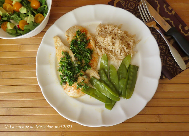 Servies ici avec un riz aux flocons d’oignon, des pois mange-tout et une petite salade à l’avocat.